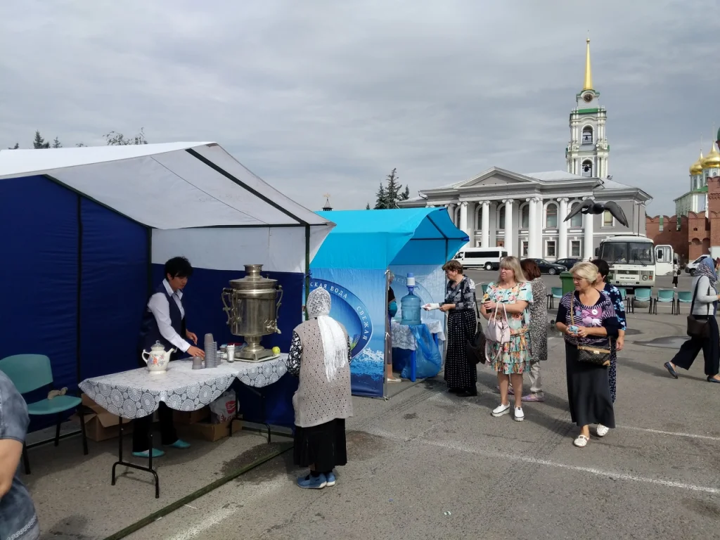 Для более комфортного ожидания на центральной площади организовали пункты раздачи питьевой воды и горячего чая из самовара. Также появились стулья.