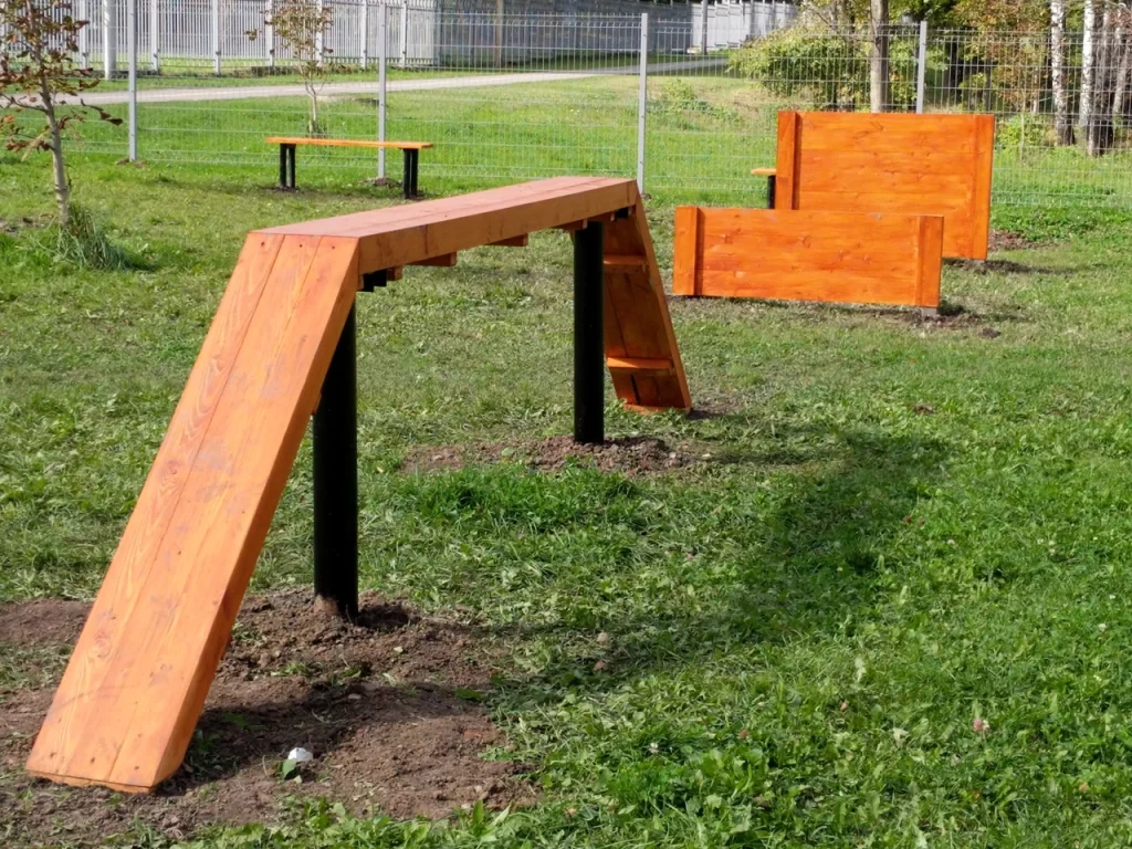 Площадка довольно просторная и оборудована горками и другими атрибутами для дрессировки четвероногих.