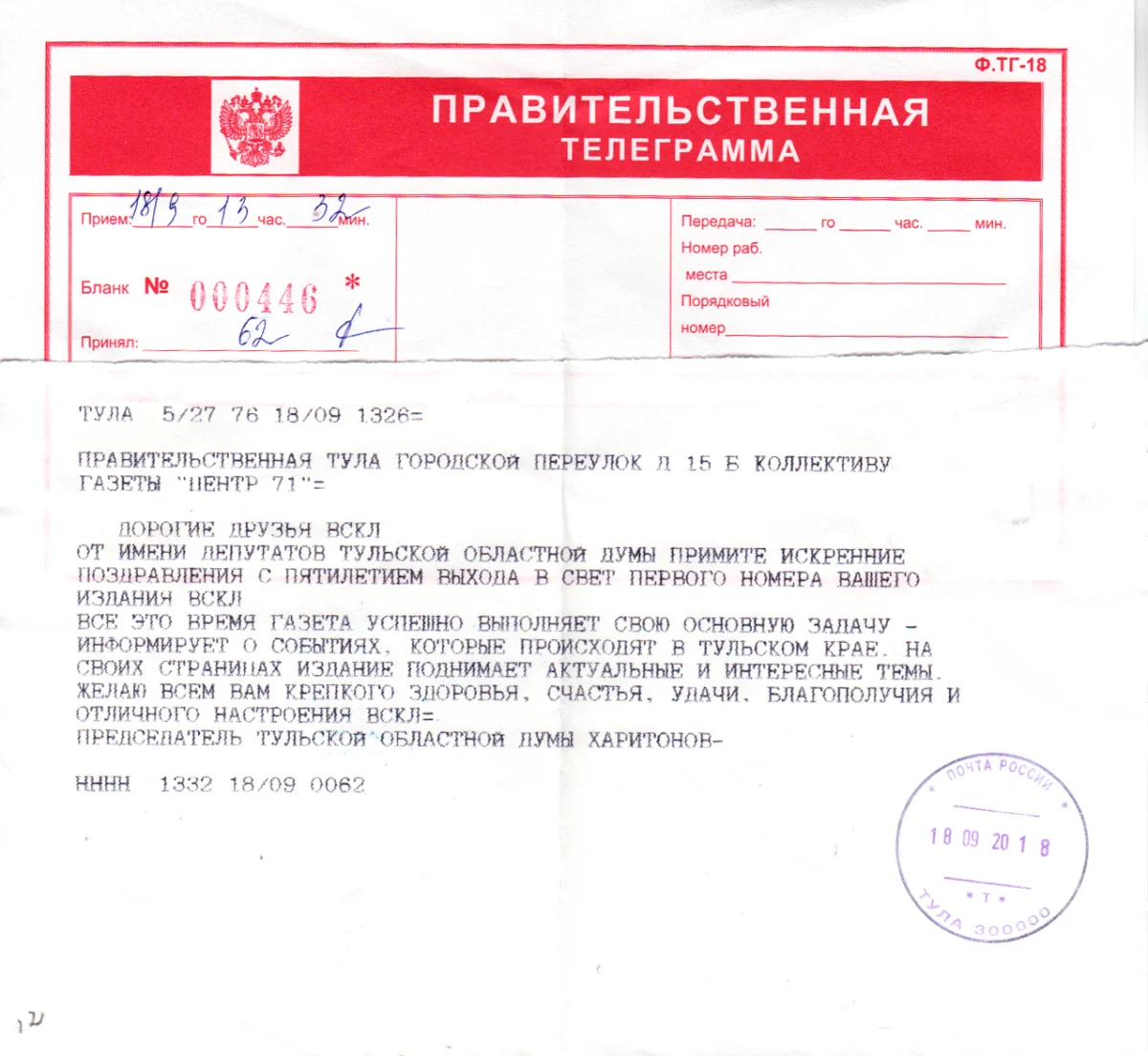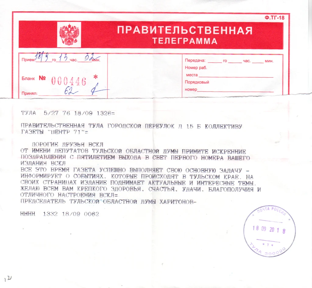 Председатель Тульской областной Думы Сергей Алексеевич Харитонов направил поздравительную телеграмму в адрес редакции «Центр71».