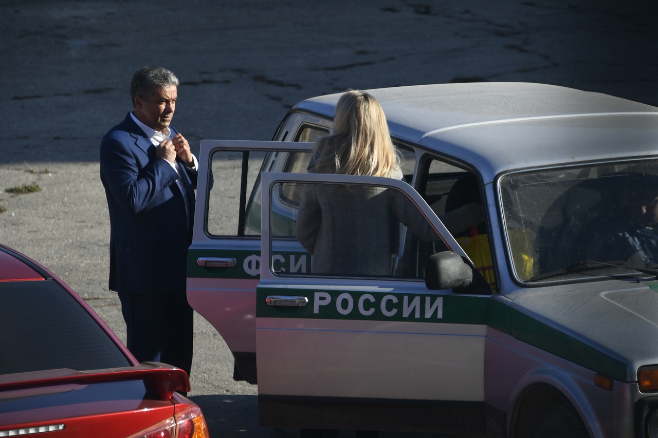 Вадима Жерздева доставили в суд на автомобиле УФСИН. Для заседания он выбрал официальный костюм, долго поправлялся, причёсывался.