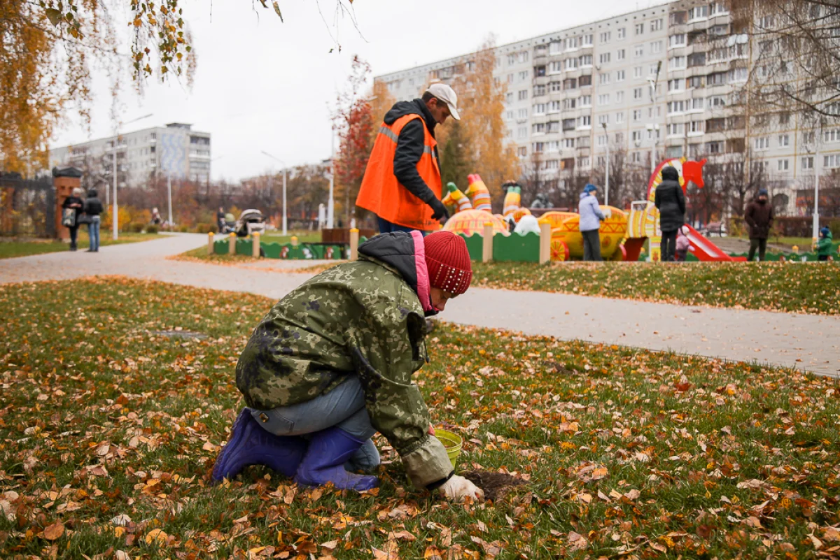 Луковицы сажали в хаотичном порядке, что позволит создать естественный природный ландшафт при прорастании.