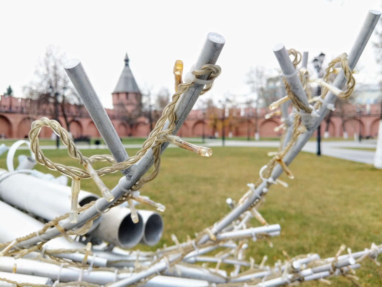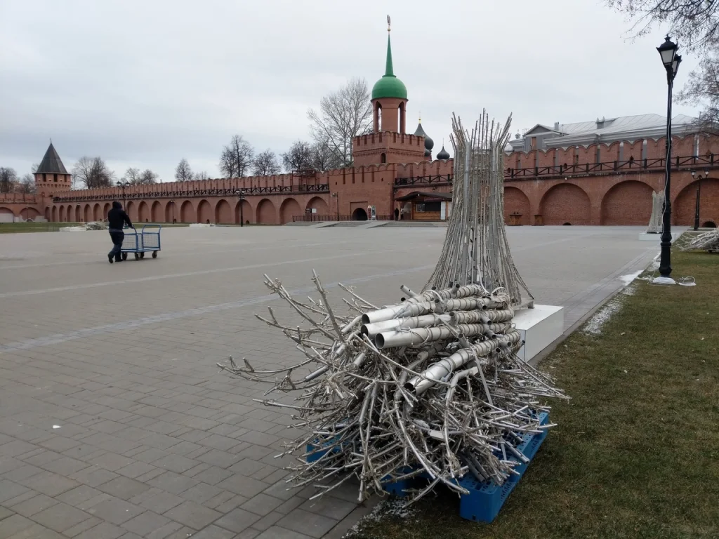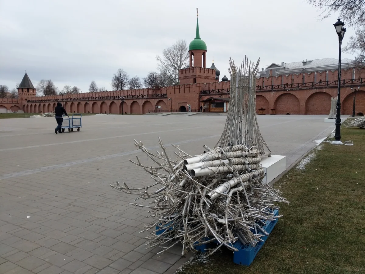 В Туле вовсю идет подготовка к Новому году. На территории кремля начали устанавливать серебристые деревья со светодиодами.