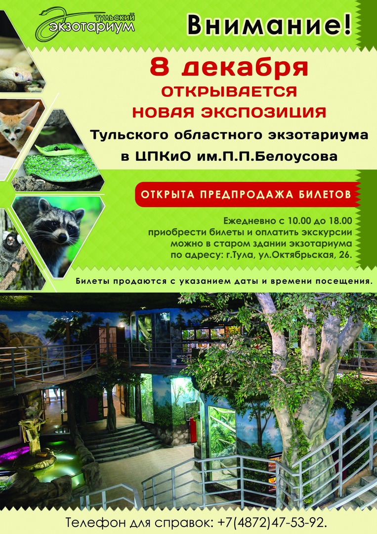Уже 8 декабря в ЦПКиО им. П.П. Белоусова откроется новое здание одного из крупнейших музеев живой природы центрального региона — Тульского экзотариума. Дом для ста с лишним зверей расположился на месте бывшего центра «Патриот», еще раньше там находился кинотеатр «Дружба» и стоял списанный самолёт «Аэрофлот», который тогдашние ребятишки облазили вдоль и поперек. Все это, к сожалению, не сохранилось, но детям (а может и внукам) определённо будет, что показать.