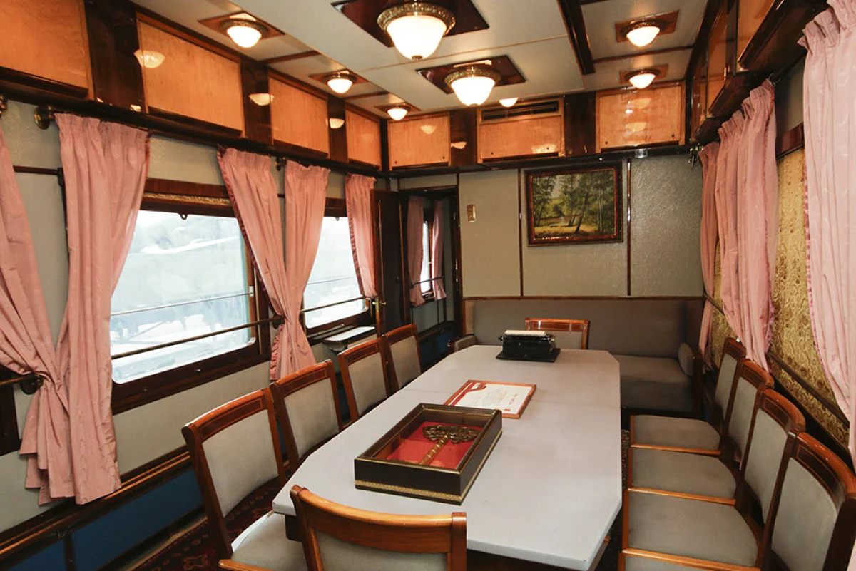 Бронированный салон-вагон является подлинным историческим объектом, в котором сохранились все предметы интерьера военного времени.