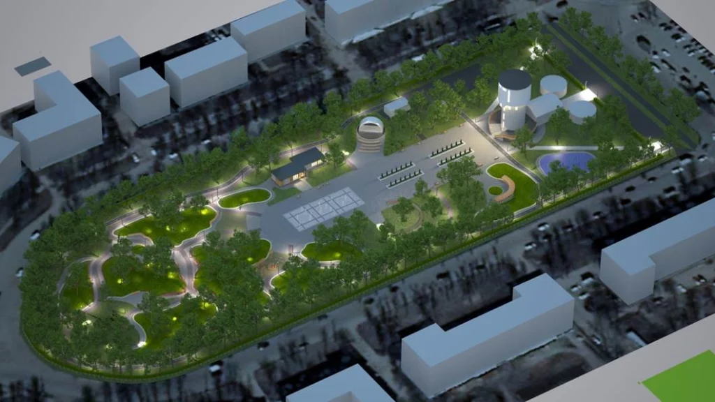 Изюминкой этого общественного пространства станет сухой фонтан. Также в сквере появятся арт-объекты и сцена для проведения праздничных мероприятий.