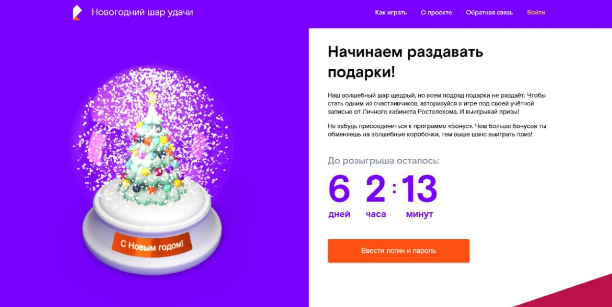 «Ростелеком» запустил онлайн-игру «Новогодний шар удачи» для абонентов-участников программы «Бонус». Все они имеют отличный шанс превратить бонусы в подарки для себя, своих родных и близких. Дарить подарки – это лучшая новогодняя традиция.