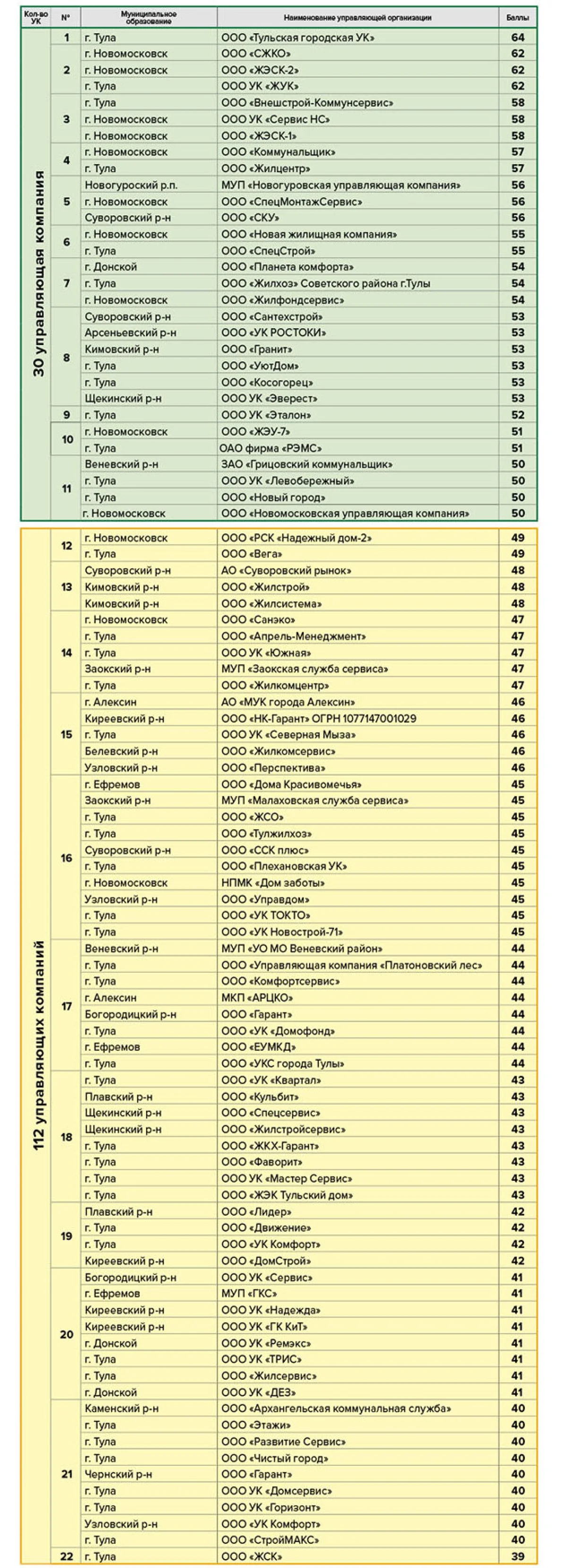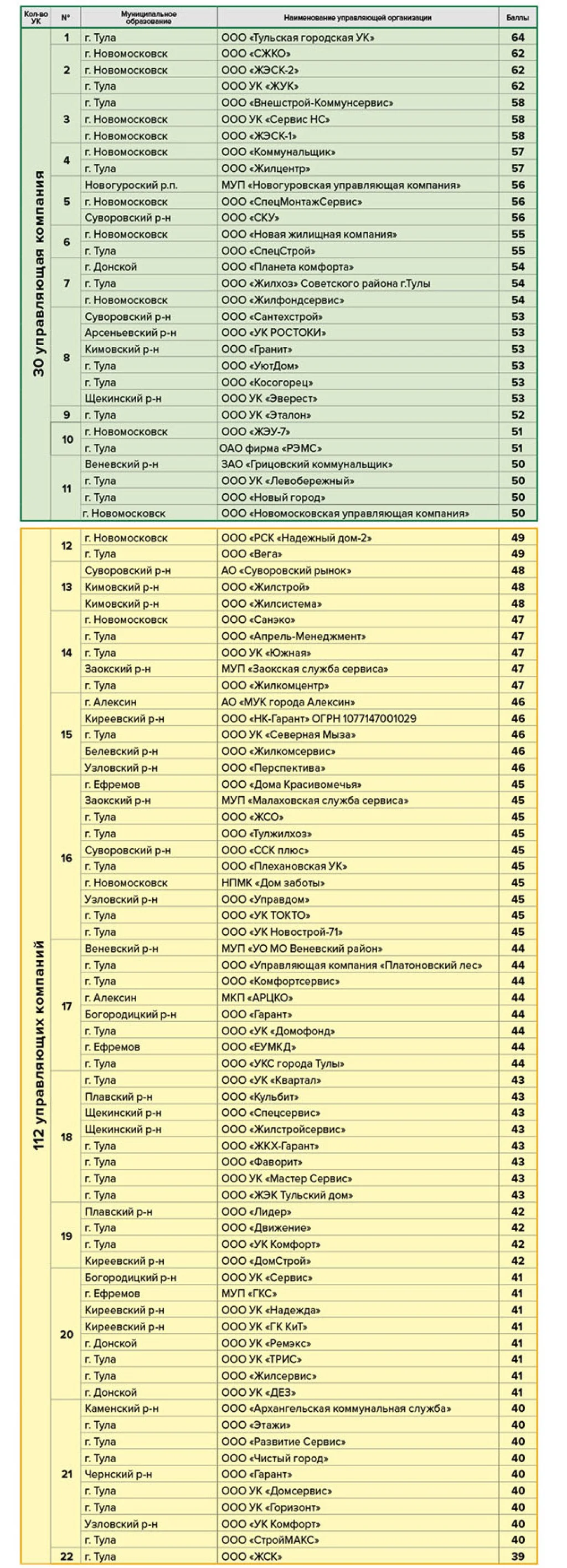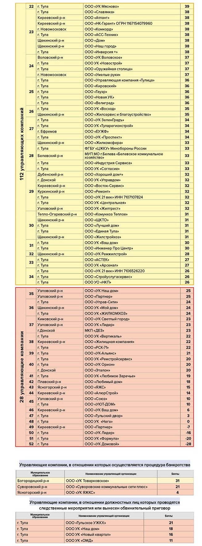 В зелёной зоне по-прежнему лидируют компании из Новомосковска и Суворова - они качественно исполняют свои обязанности, не имеют долгов, не привлекались к административной ответственности.