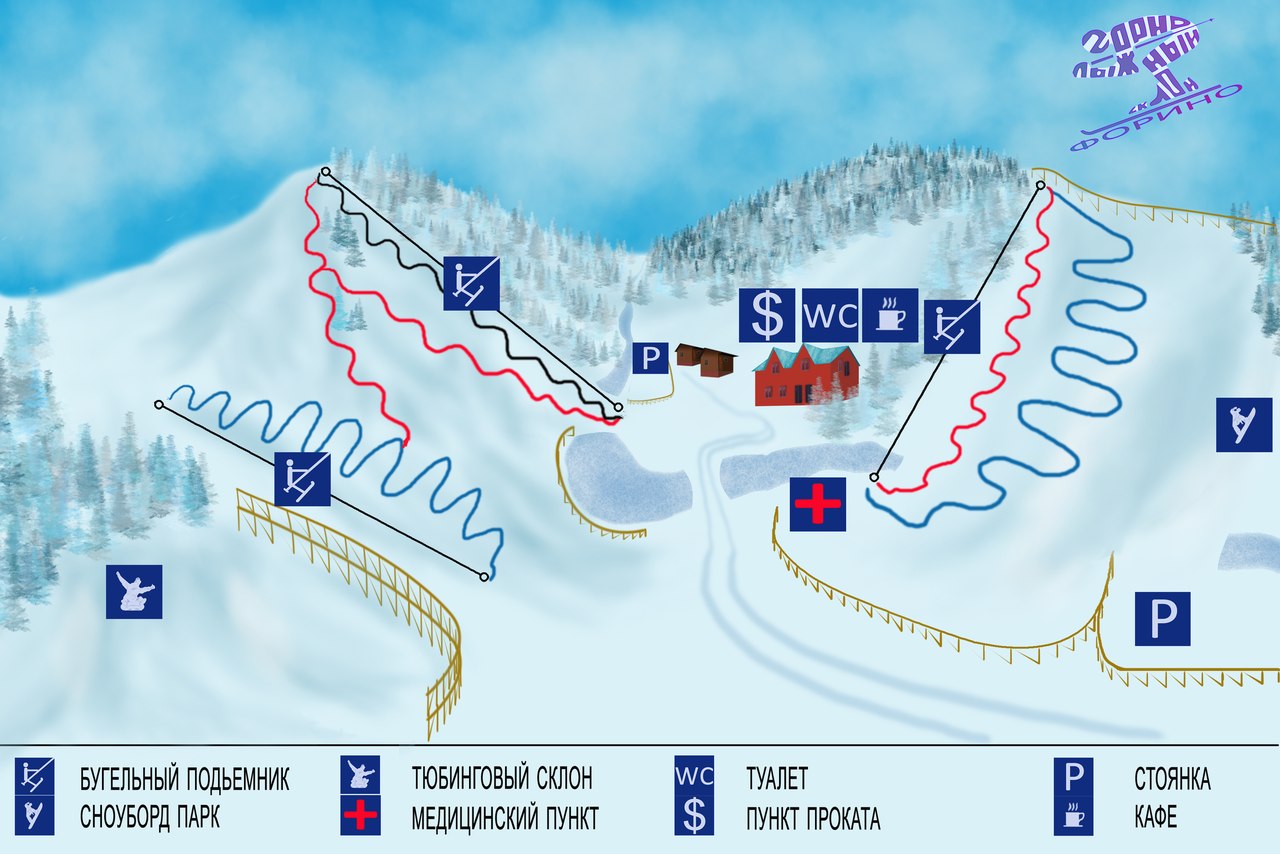 В «Форино» два основных склона. Более пологий подойдёт для начинающих. Тот, что повыше — для опытных райдеров. Отдельная история — «чёрная» трасса, получившая в народе название «крутяк». Когда вы перейдёте из разряда «чайников» в разряд «кипятильников» — можете попробовать одолеть и её. Средняя протяжённость спусков - 150 м.