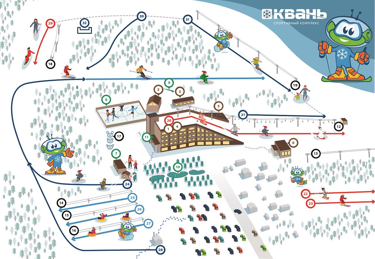 + Прекрасные горки разной высоты и степени сложности. Удобные подъемники, в том числе и для начинающих (траволатор). Стоит отметить отсутствие огромных очередей на подъемнике и просторную раздевалку, которая вмещает всех желающих.