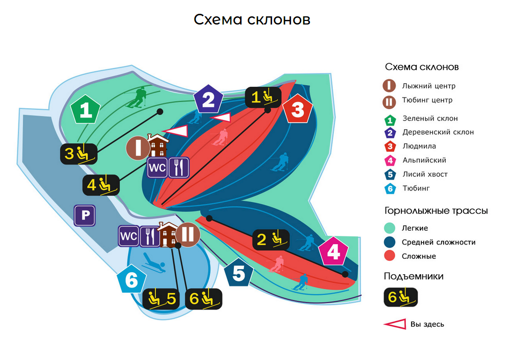 Тюбинговых трассы — две. Каждая по 150 метров. Перепады высот на склонах 30-40 м.