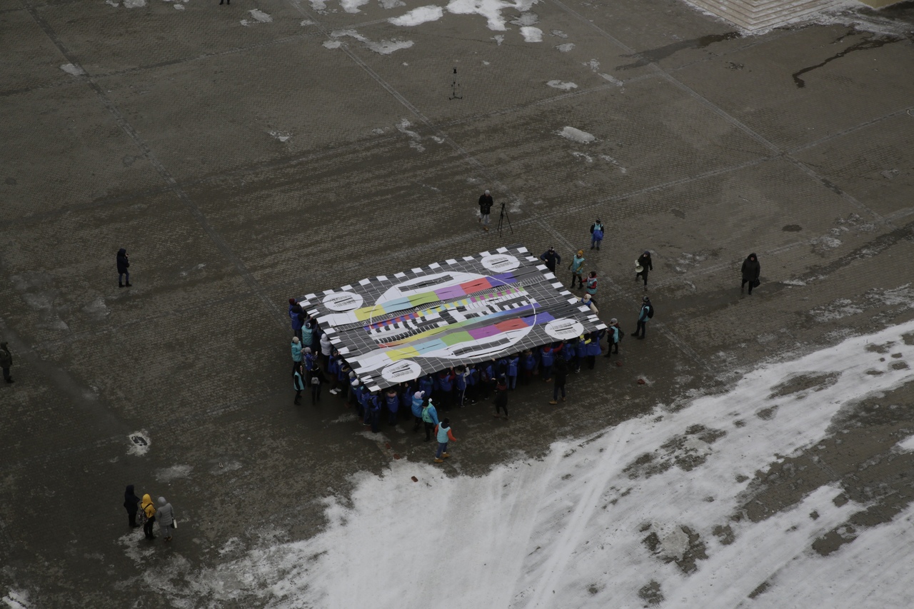 Участники флешмоба - все желающие - в брендированных жилетках РТРС и с табличками в руках сложили фирменную бабочку РТРС с логотипами 20 каналов двух мультиплексов.