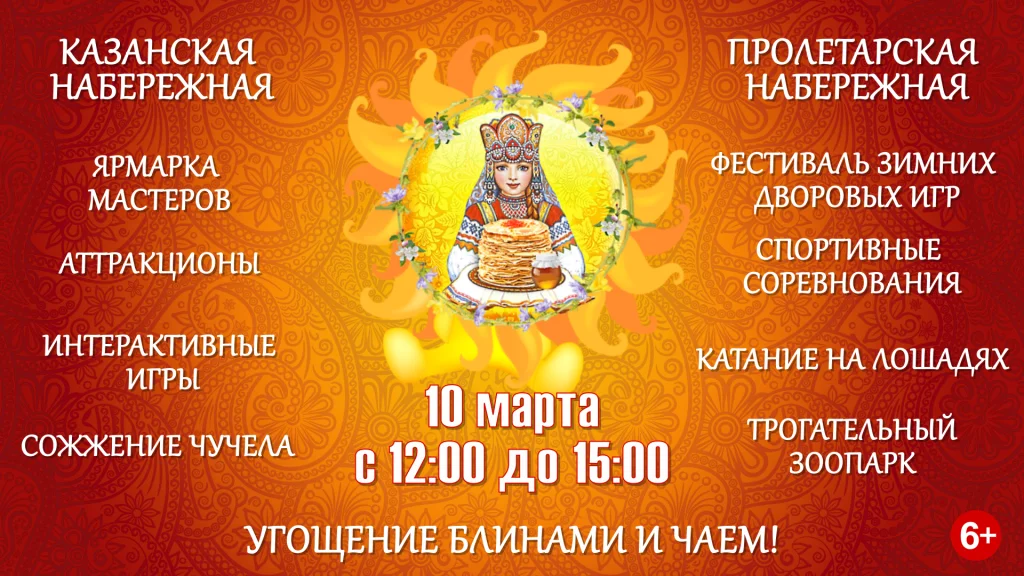 10 марта 2019 года, с 12:00 до 15:00 основными городскими площадками для масленичных гуляний станут Казанская и Пролетарская набережные.