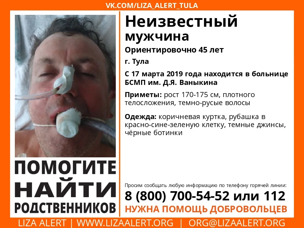 17 марта в тульскую больницу им. Д.Я. Ваныкина был доставлен неизвестный мужчина в тяжёлом состоянии. На вид около 45 лет.