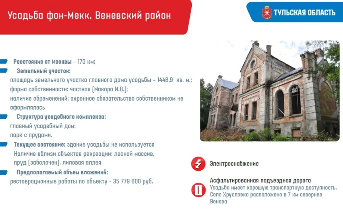 Усадьба знаменитого барона фон Мекк располагается в селе Хрусловка Веневского района Тульской области, выстроена в романском стиле по проекту архитектора Сергея Экарева. Сохранились воспоминания об отделке, обстановке 24-х комнат этого дворца, согласно которым каждая комната была уникальна. В усадебном доме были дубовый, ореховый, ясеневый залы, а также «китайский» - со стенами, обитыми китайским шелком. Были комнаты, выкрашенные под серебро и золото, с мебелью из орехового дерева и карельской березы. Но самой оригинальной считалась «зеркальная» комната, которая была сплошь украшена зеркалами, которые были и на стенах, и на потолке, и даже на полу.
