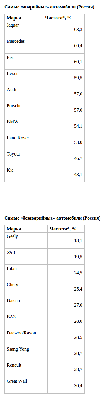 В России самой «аварийной» маркой является Jaguar (63,3%). Места со второго по четвертое достались Mercedes (60,4%), Fiat (60,1%) и Lexus (59,5%). Замыкают первую российскую десятку в порядке убывания Audi, Porsche, BMW, Land Rover, Toyota и Kia.