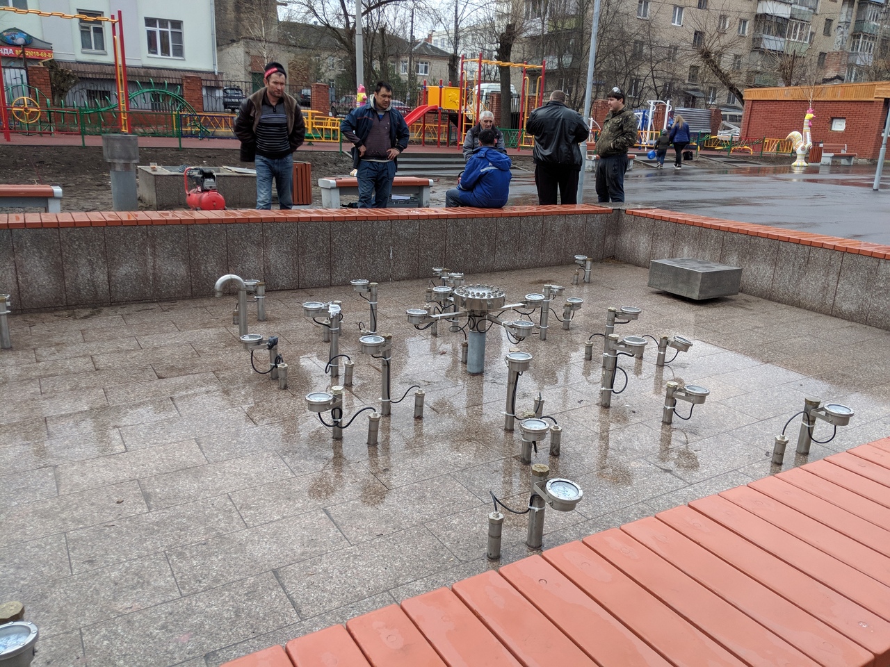 Рабочие уже налаживают аттракцион и занимаются обустройством фонтана.