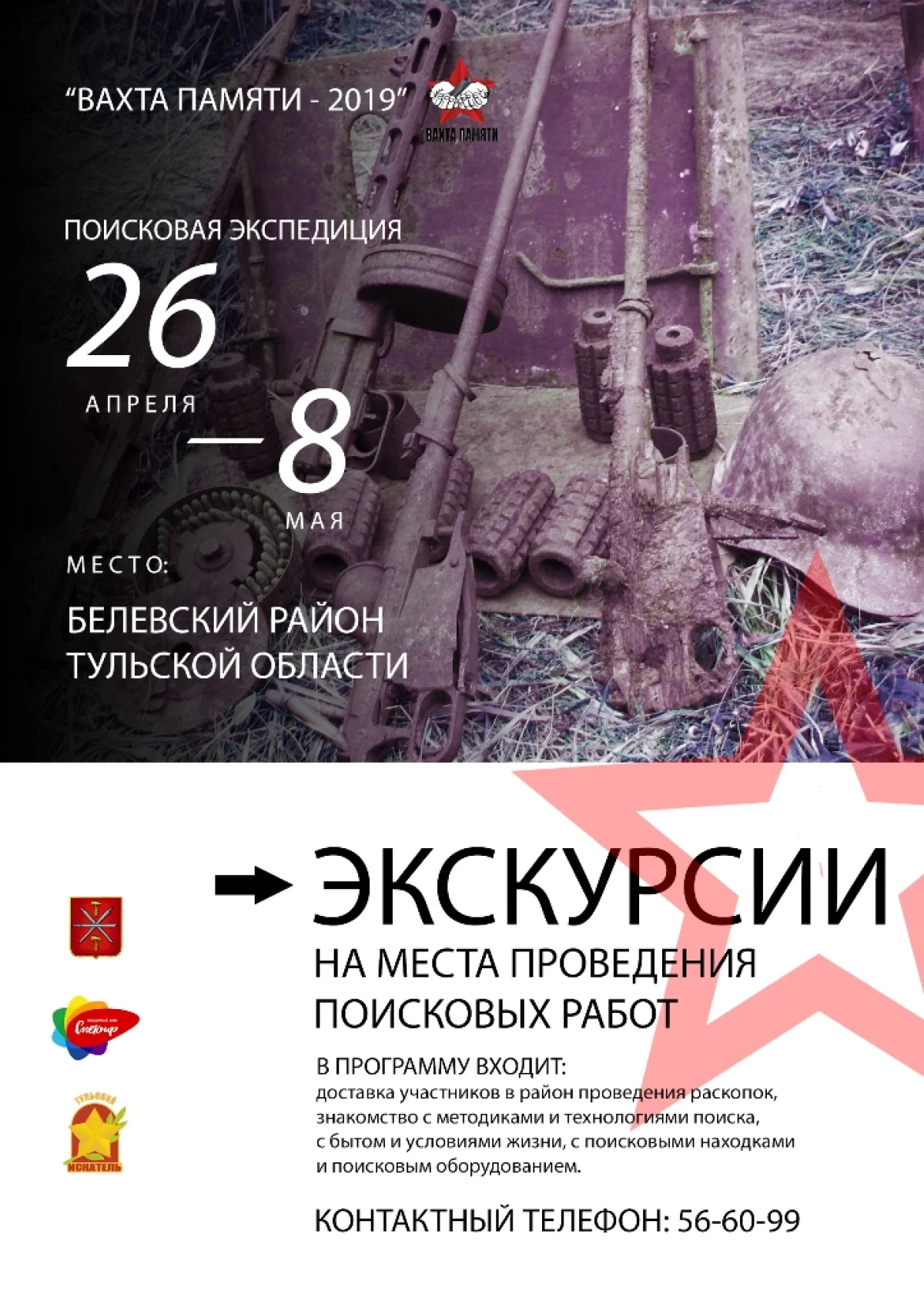 В рамках «Вахты Памяти-2019» региональная общественная молодежная патриотическая организация «Тульский Искатель» проводит поисковую экспедицию в Белевском районе Тульской области с 26 апреля по 8 мая.