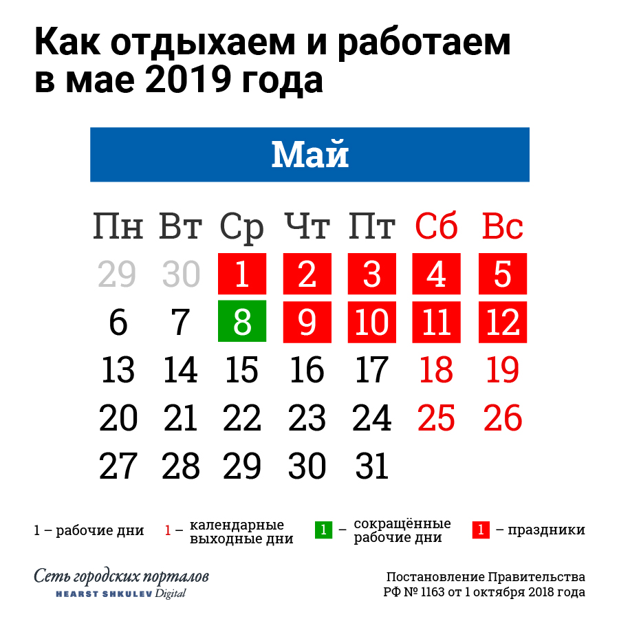При этом 30 апреля и 8 мая соответственно будут сокращёнными рабочими днями.