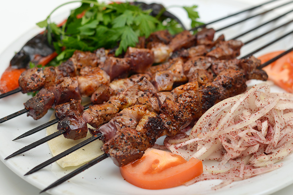 Мякоть баранины нарезать кусочками по 15 — 20 г, сложить в неокисляющуюся посуду, добавить нашинкованный репчатый лук, винный уксус, анис, красный перец, перемешать и, уплотнив, оставить в холодном месте на 3 — 4 часа. Перед жаркой кусочки подготовленной таким образом баранины нанизать на металлические шпажки по 4 — 5 кусочков на одну шпажку вперемежку с кружочками сырого репчатого лука, посыпать пшеничной мукой, на конец каждой шпажки насадить по кусочку курдючного сала и жарить над раскалёнными углями. Подать сразу же после жарки на шпажках. В качестве гарнира можно подать нашинкованный сырой репчатый лук и зелень петрушки.