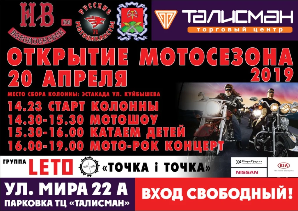 - 14.23 - старт колонны мотоциклов (эстакада ул. Куйбышева), парковка у ТЦ «Талисман» (ул. Мира, 22а)