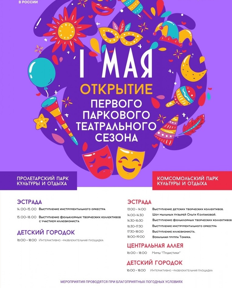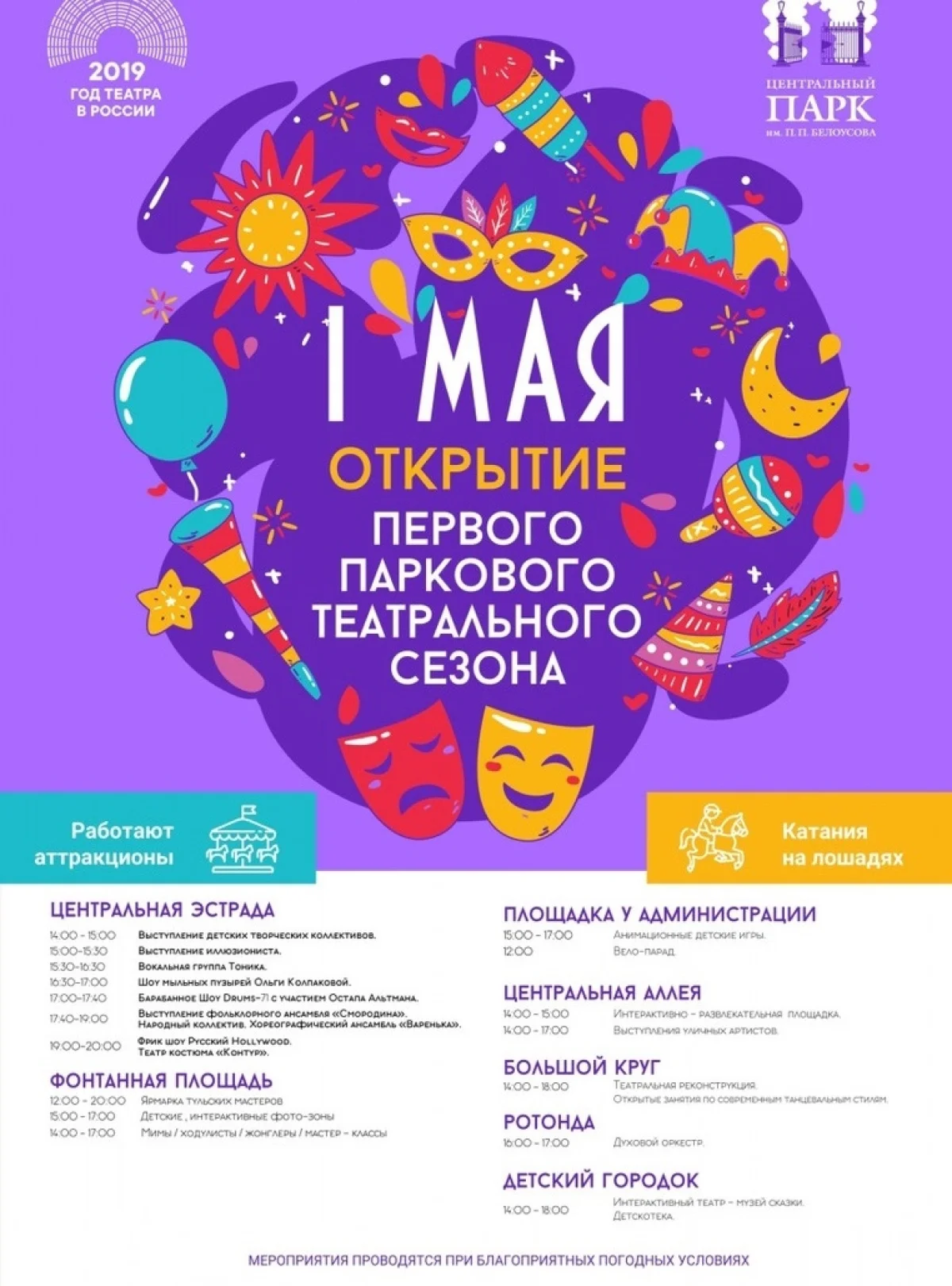 1 мая в Центральном, Комсомольском и Пролетарском парках Тулы пройдут интересные и разнообразные театрализованные мероприятия.