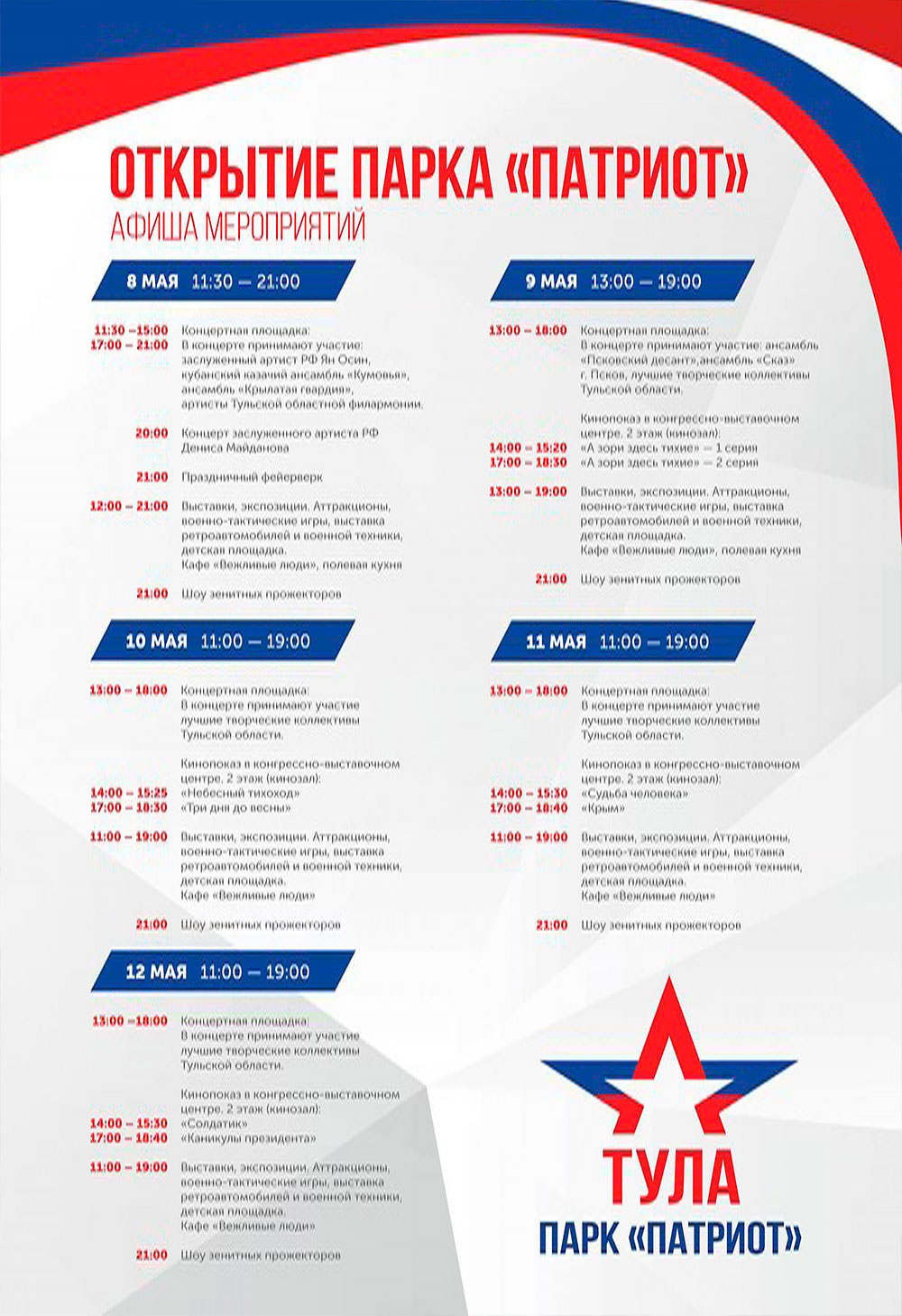 Торжественное открытие парка «Патриот» состоится в Туле 8 мая. Начало праздничной программы в 11.30.