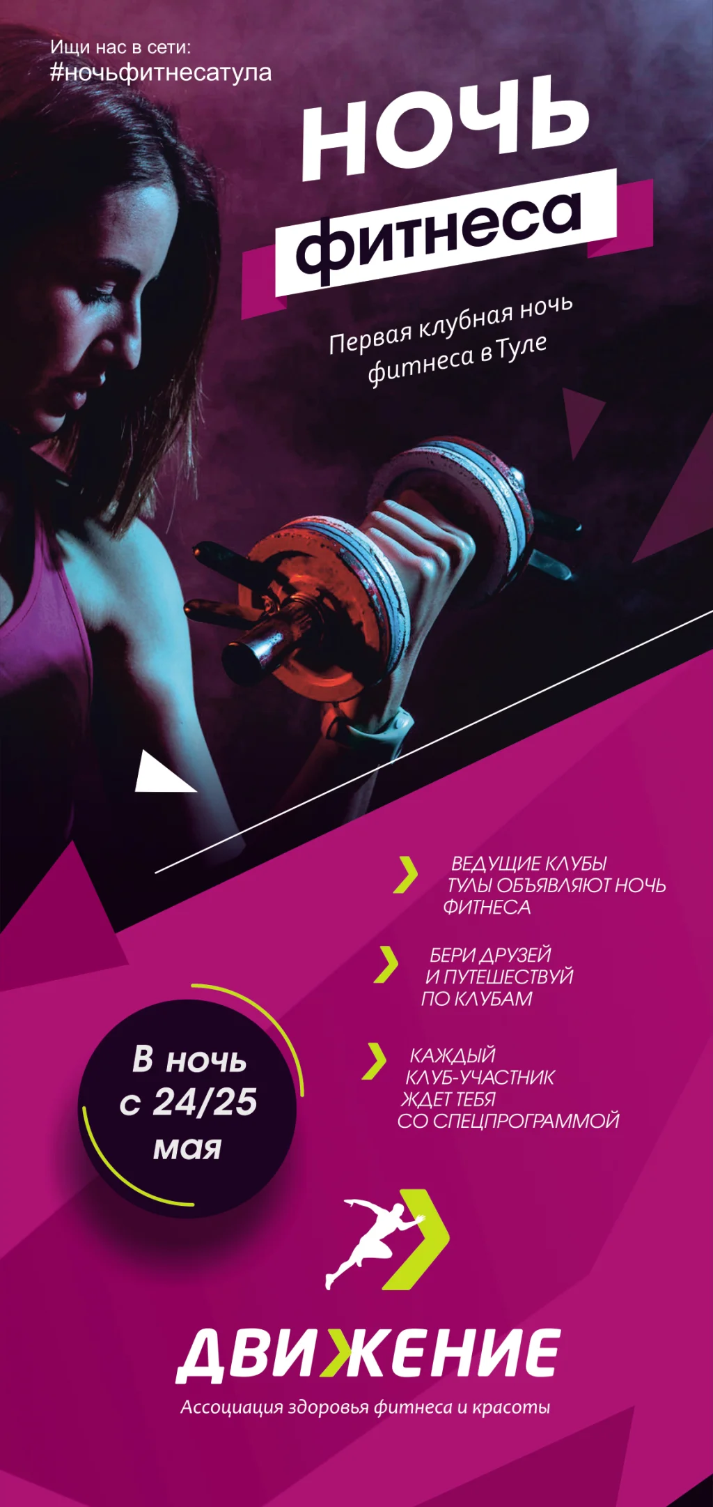 Участники Ассоциации здоровья, фитнеса и красоты «Движение» объявили о совместной акции «Ночь фитнеса» в Туле. 24 мая фитнес-клубы Ассоциации готовят для туляков спецпрограммы. В этот вечер с 21:00 и до полуночи вход в клубы будет свободным!
