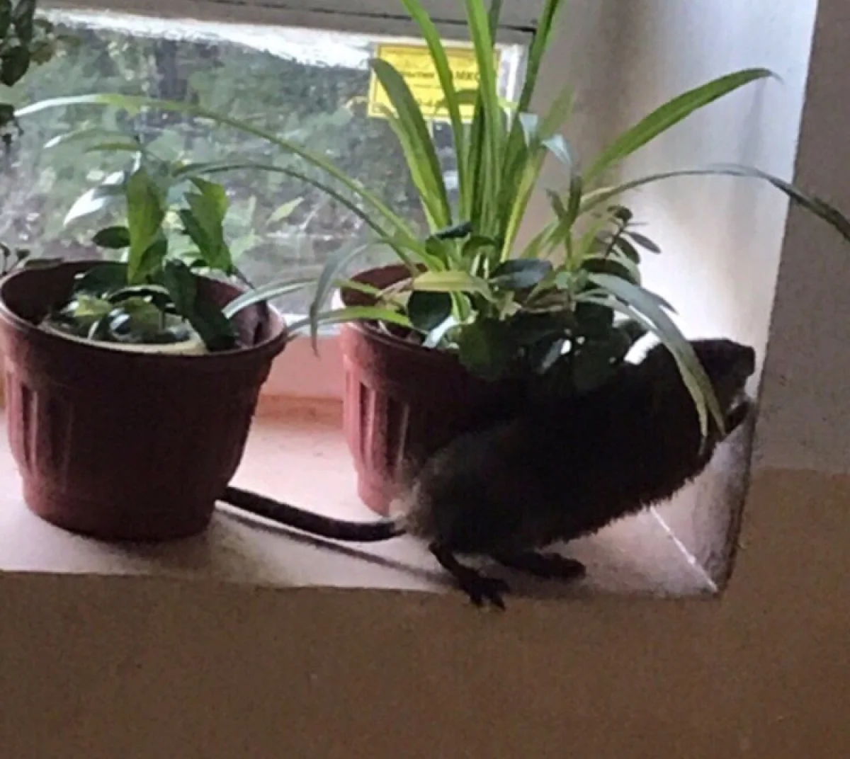 Ондатра поселилась на подоконнике среди цветов. Откуда она взялась в подъезде — неизвестно. То ли сбежала от хозяина, то ли из парка пришла. Очевидцы отмечают, что зверёк совсем домашний — людей не боится, не прячется и не убегает.