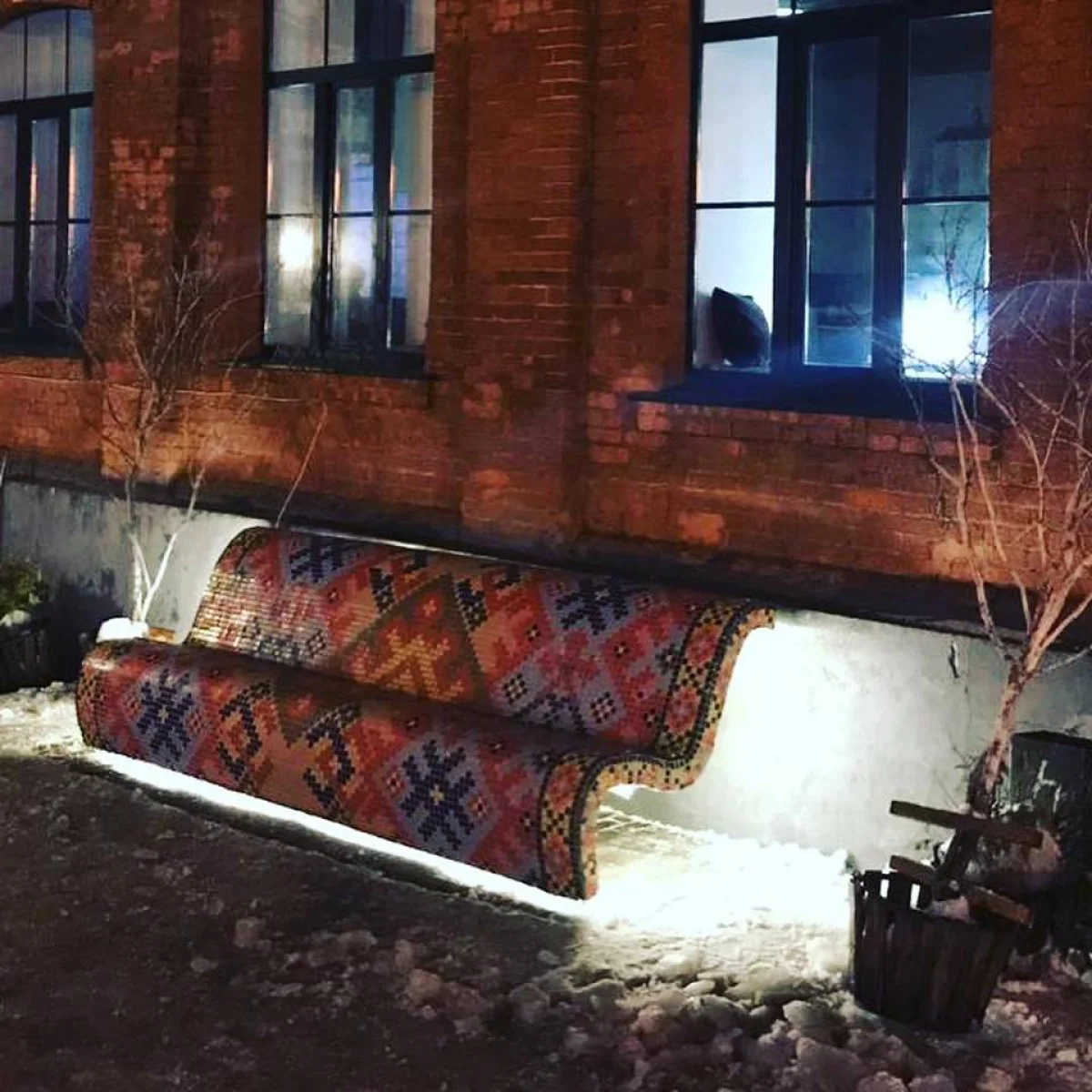 Исполненная в технике мозаики скамья «Сила узора» имитирует множество вышитых мотивов, которые использовались девушками на Руси как оберег для встречи своего единственного, создания семьи и долгой счастливой совместной жизни.