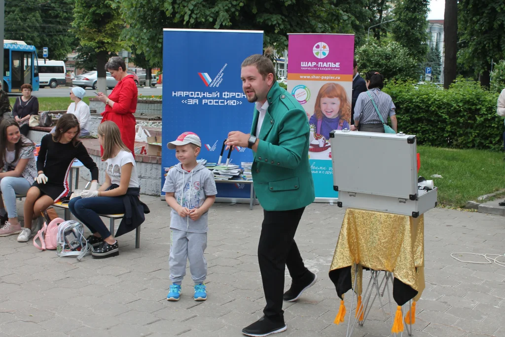 После того, как книги были подарены, на площадке перед детской библиотекой началась развлекательная программа. Свои стихи, искрометные и забавные, прочитал тульский детский поэт Игорь Золотов. Для детей и их родителей выступил финалист «Шоу талантов», участник многочисленных проектов на телеканале «Россия 1», иллюзионист Илья Коржов. Также мастер-классы провели представители музея «Тульские древности»: сотрудники научили детей делать рисунки в стиле средневековой гравюры, а региональный оператор «Хартия» провел викторину и игровое обучающее занятие о том, как следует обращаться с мусором, чтобы беречь экологию родного края.