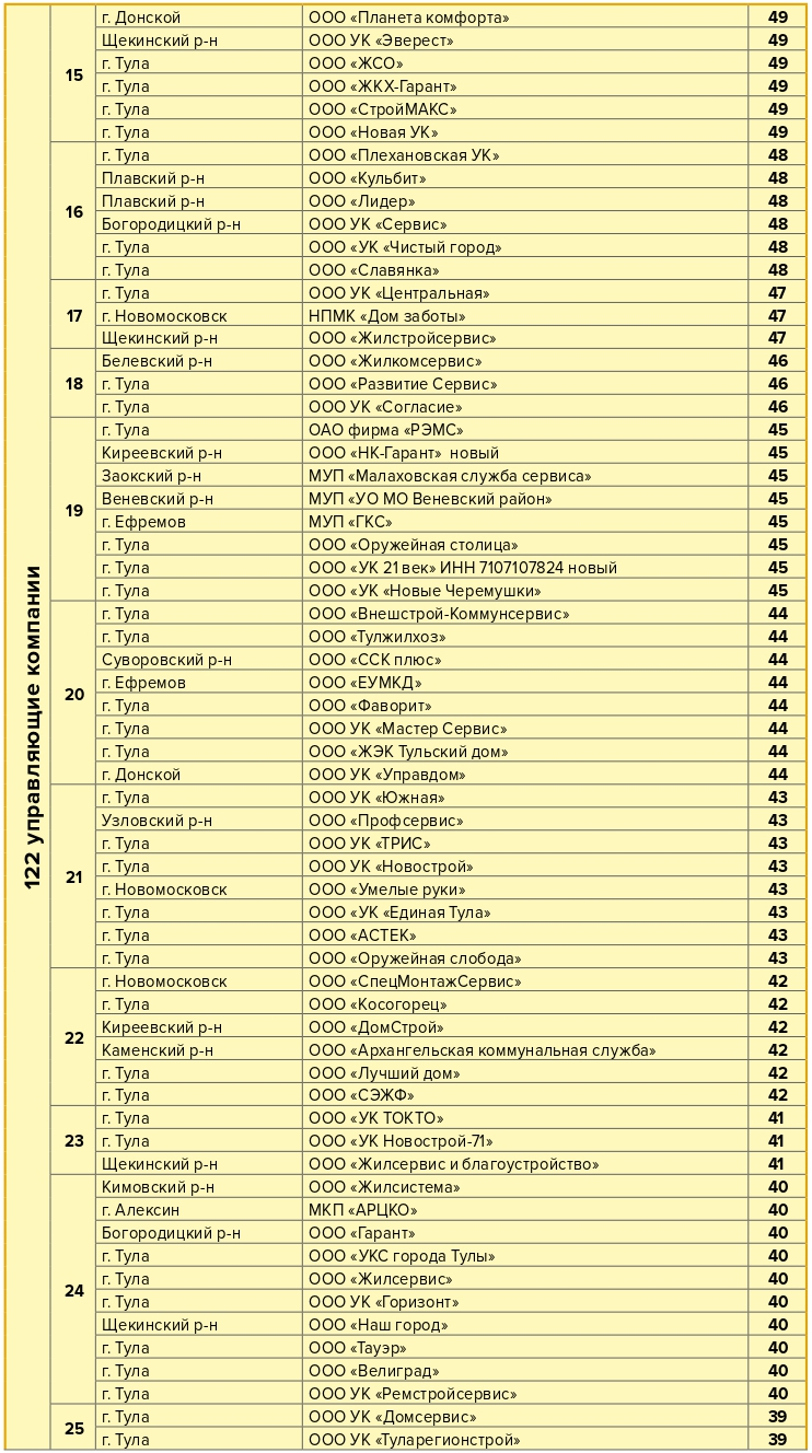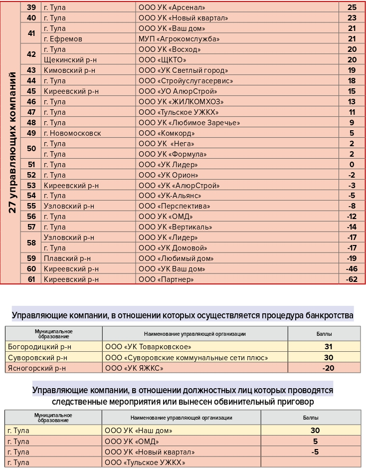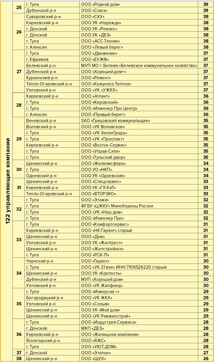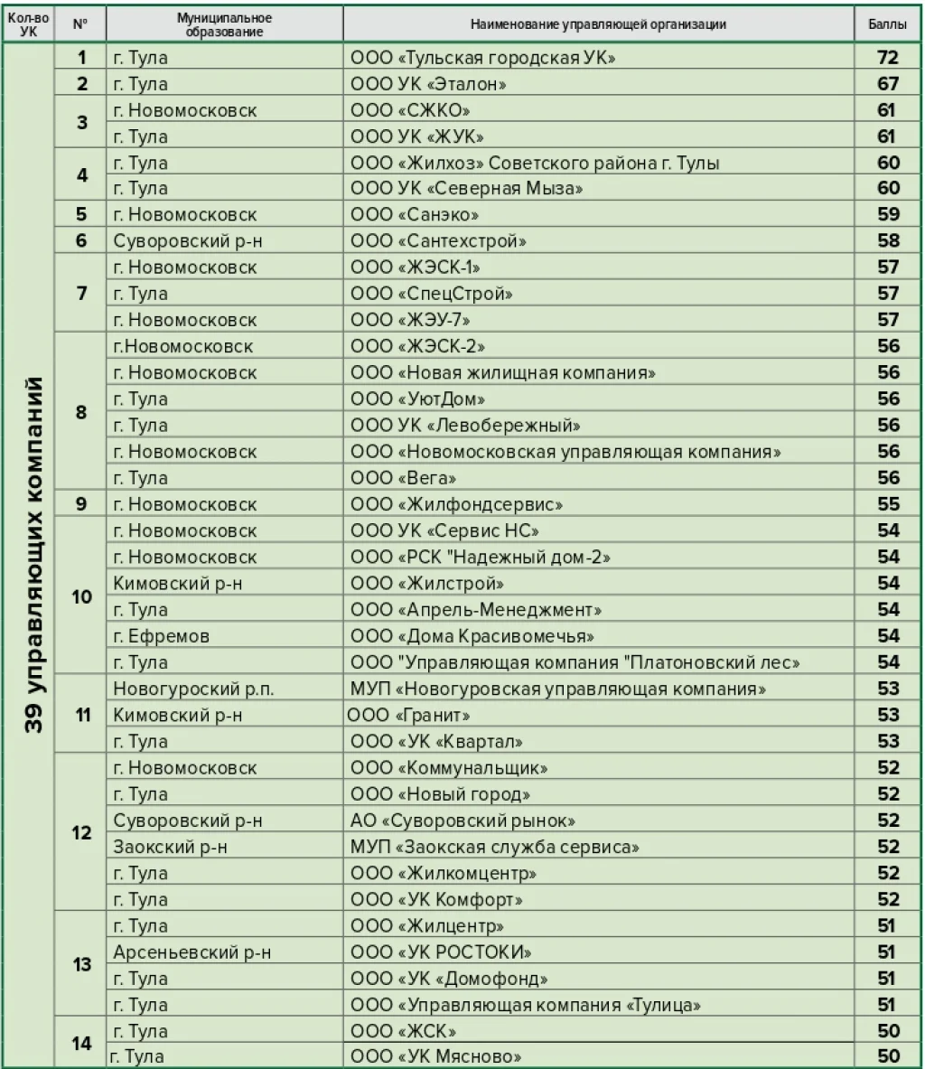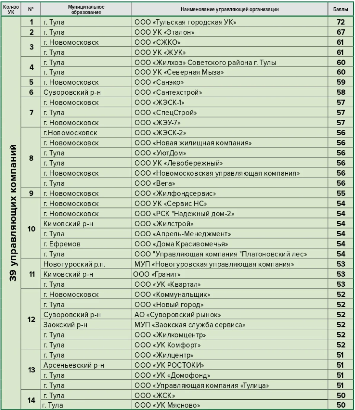 По словам Леонида Ивченко, количество компаний в зелёной группе увеличилось. Это связано с переходом на прямые договора с ресурсниками. При этом «Тульская городская УК» снова возглавила список лидеров.