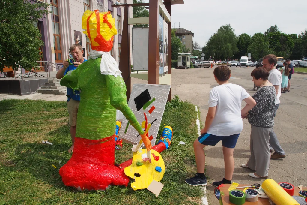 Художник Дмитрий Цветков представил оригинальную композицию – фигура художника из скотча. Как отмечает участник мастер-класса Михаил: «Мы уже выходили из парка и собирались ехать домой, но мы увидели необычную фигуру, которую обклеивают скотчем, я с удовольствием присоединился, это очень оригинально, мне нравится, хочется побольше таких креативных событий».