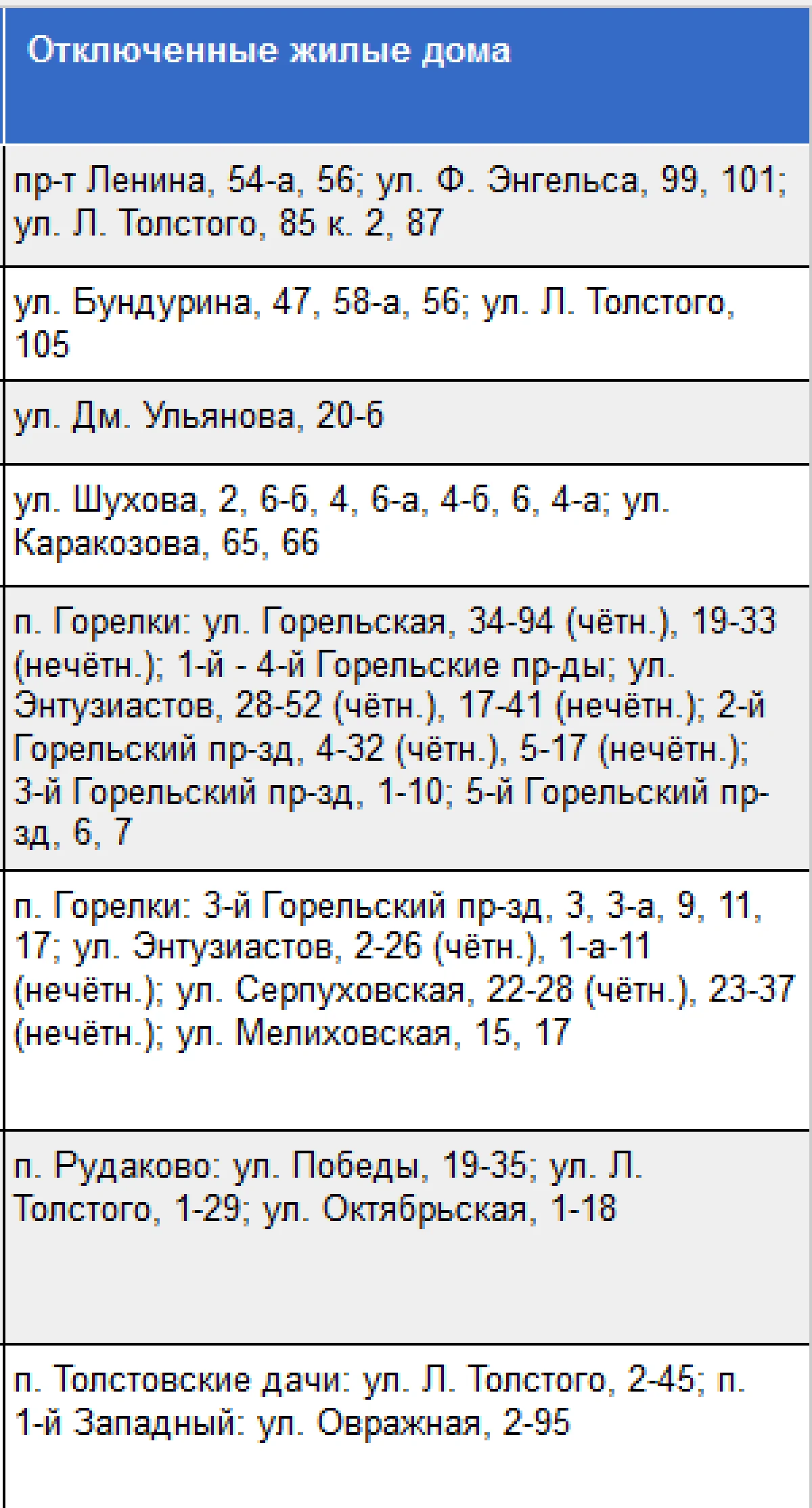 Центр71 публикует список адресов, по которым не будет света во вторник, 27 августа.