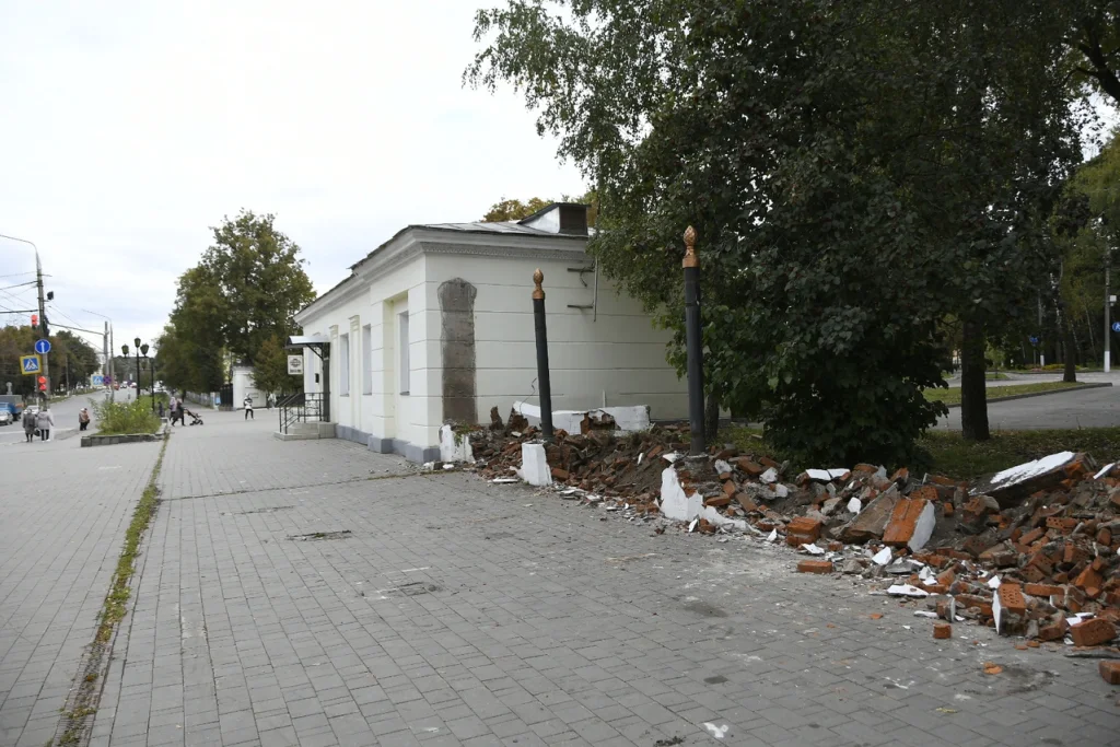 На данный момент рабочие полностью демонтировали старый металлический забор, остались только вертикальные трубы с наконечниками, сейчас идет разборка кирпичного основания.