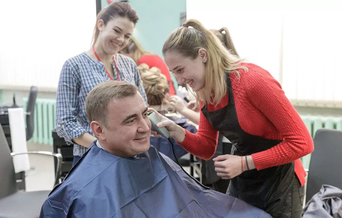 Алексей Дюмин посетил тульский колледж и подстригся у начинающих парикмахеров