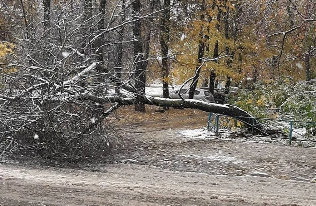 Первый снег повалил дерево на ул. Кутузова в Туле