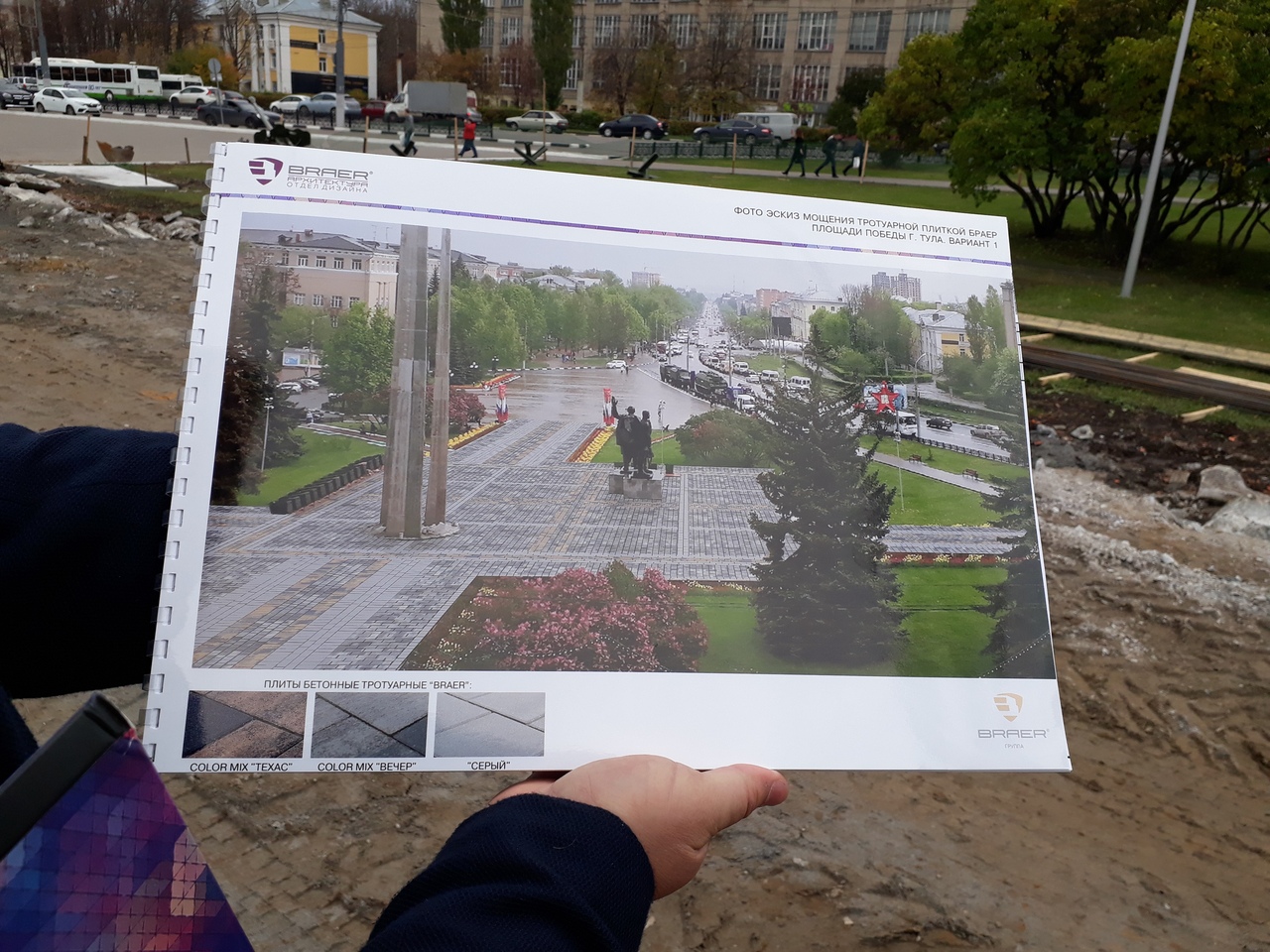 Подрядчик сообщил, что финальным покрытием площади будет крупная тротуарная плитка. Рисунок и цветовую гамму оставят такую же. Кроме того, переоблицуют постаменты.