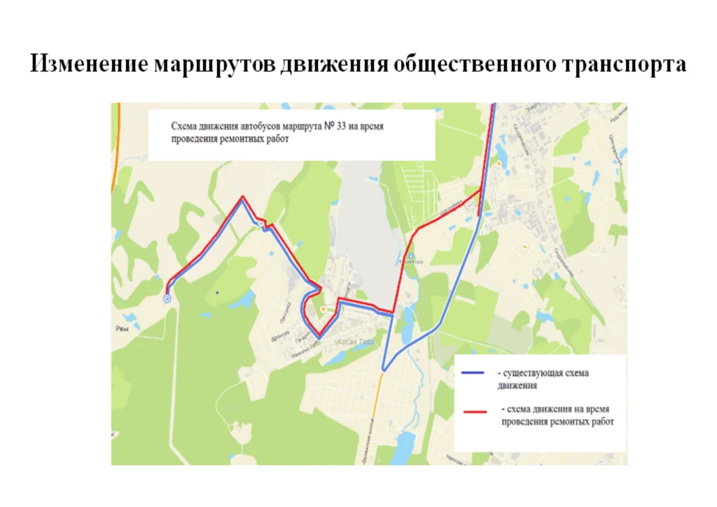 Автобусы маршрутов №№ 28, 33 и троллейбусы № 12, которые перевозят жителей поселка Косая Гора, будут осуществлять движение по временной схеме через Орловское шоссе на ул. Шоссейную (мкрн Первомайский) с выходом на Щекинское шоссе в районе Ивановских дач.