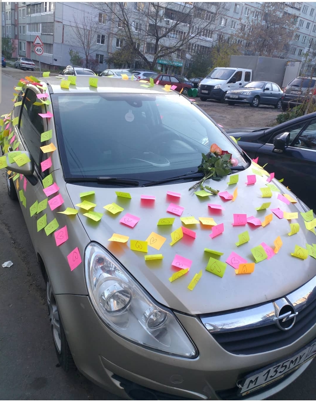 Романтичное признание-сюрприз ждёт незнакомку ранним утром на улице Революции в Туле. В одном из дворов поклонник оставил стикеры сердечек на авто любимой, а также положил цветы.