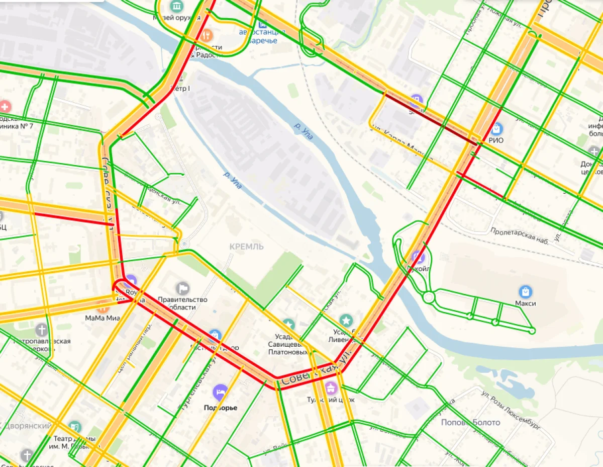 Судя по Яндекс.Картам, движение транспорта затруднено по ул. Советской в обе стороны, по ул. Староникитской, Демидовской плотине, Октябрьской, Агеева, Болдина, 9 мая и проспекту Ленина в сторону выезда из города.