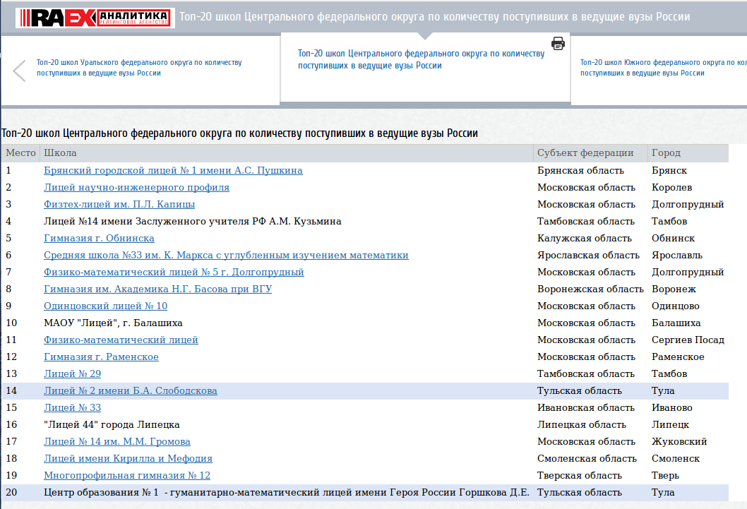 Среди остальных учебных заведений из 17 городов Центральной России, Тула заняла сразу две топовых позиции в данном рейтинге. В таблицу попали такие учебные заведения как Лицей № 2 имени Б.А. Слободскова и Центр образования № 1 - гуманитарно-математический лицей имени Героя России Горшкова Д.Е.