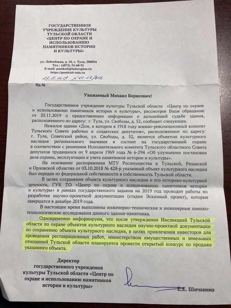 Будем готовить письмо губернатору Тульской области А.Г. Дюмину.», - так отстаивают позицию свою и здания