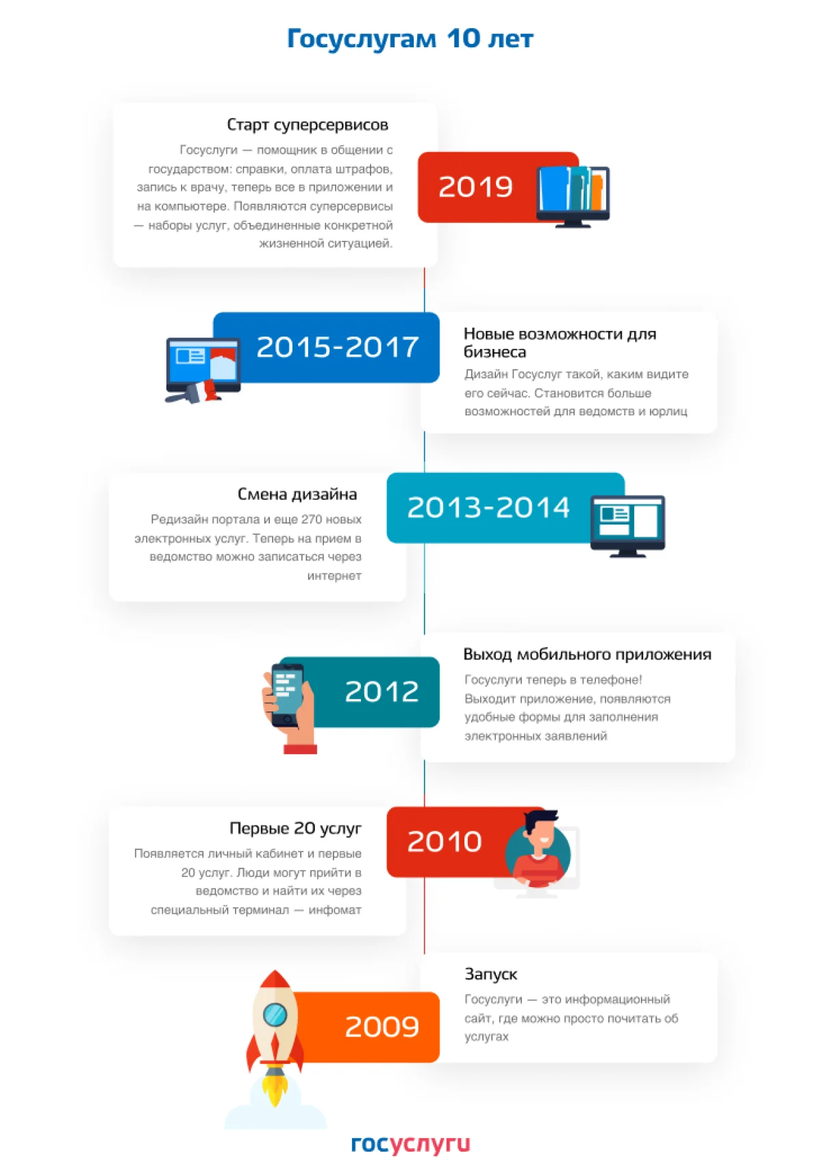 Единому порталу госуслуг исполнилось 10 лет. 15 декабря 2009 года, в день официального открытия, на портале была размещена информация о 110 услугах федерального и более 200 — регионального и муниципального уровней.