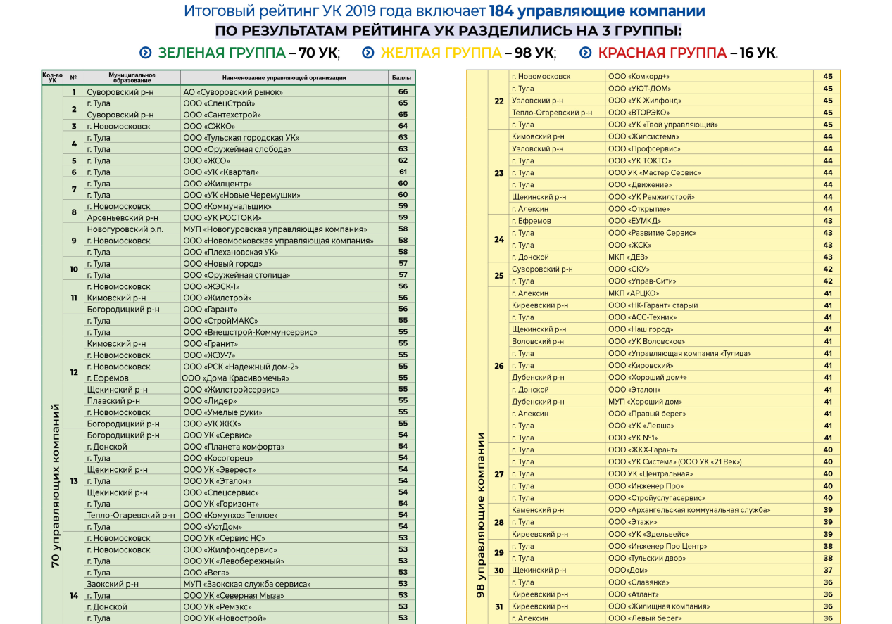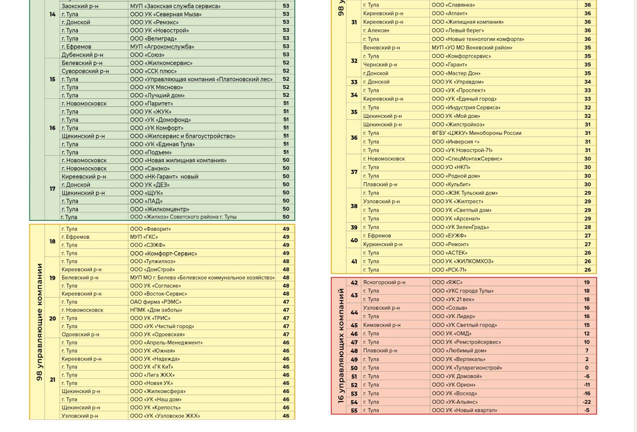 В Туле огласили итоговый рейтинг управляющих компаний региона за 2019 год. Все компании поделили на три зоны – «зеленую», «желтую» и «красную». Чтобы попасть в «желтую» зону, необходимо набрать 26 баллов, для прохождения в «зеленую» зону управляющая компания должна получить 50 баллов и более.