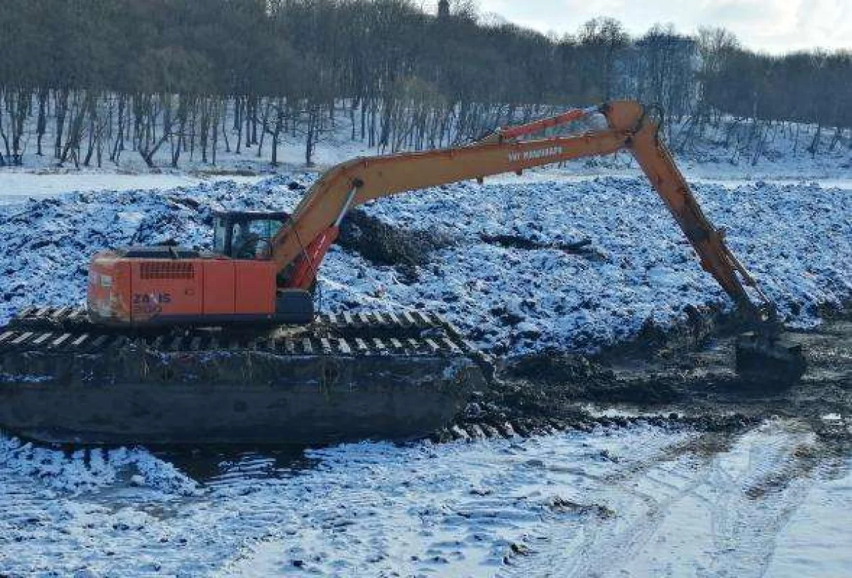 В Богородицке расчищают городской пруд. Сейчас идет активная фаза работ. Специалисты расчищают центральную часть пруда.