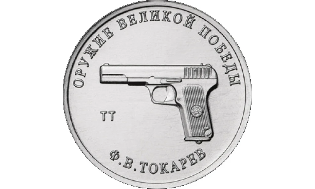 Монета сделана из недрагоценных металлов. На ней красуется чеканное изображение знаменитого оружие со знаменитой аббревиатурой ТТ — Тульский Токарев. Внизу по окружности имеется надпись «Оружие Великой Победы».