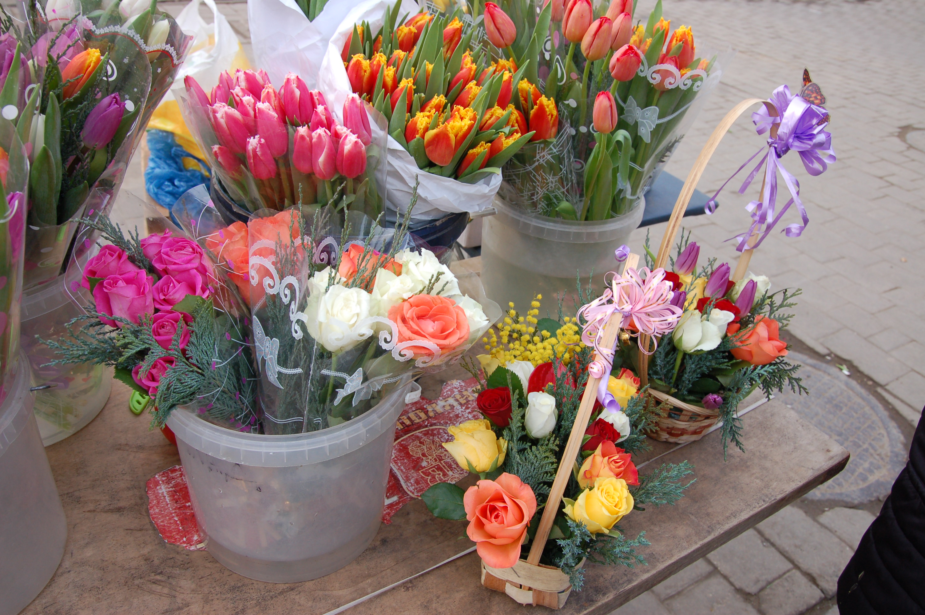 Традиционные тюльпаны разбираются, как горячие пирожки с самого утра — в основном для поздравлений коллег в рабочих коллективах. Вечером букеты покупают уже для дам сердца.