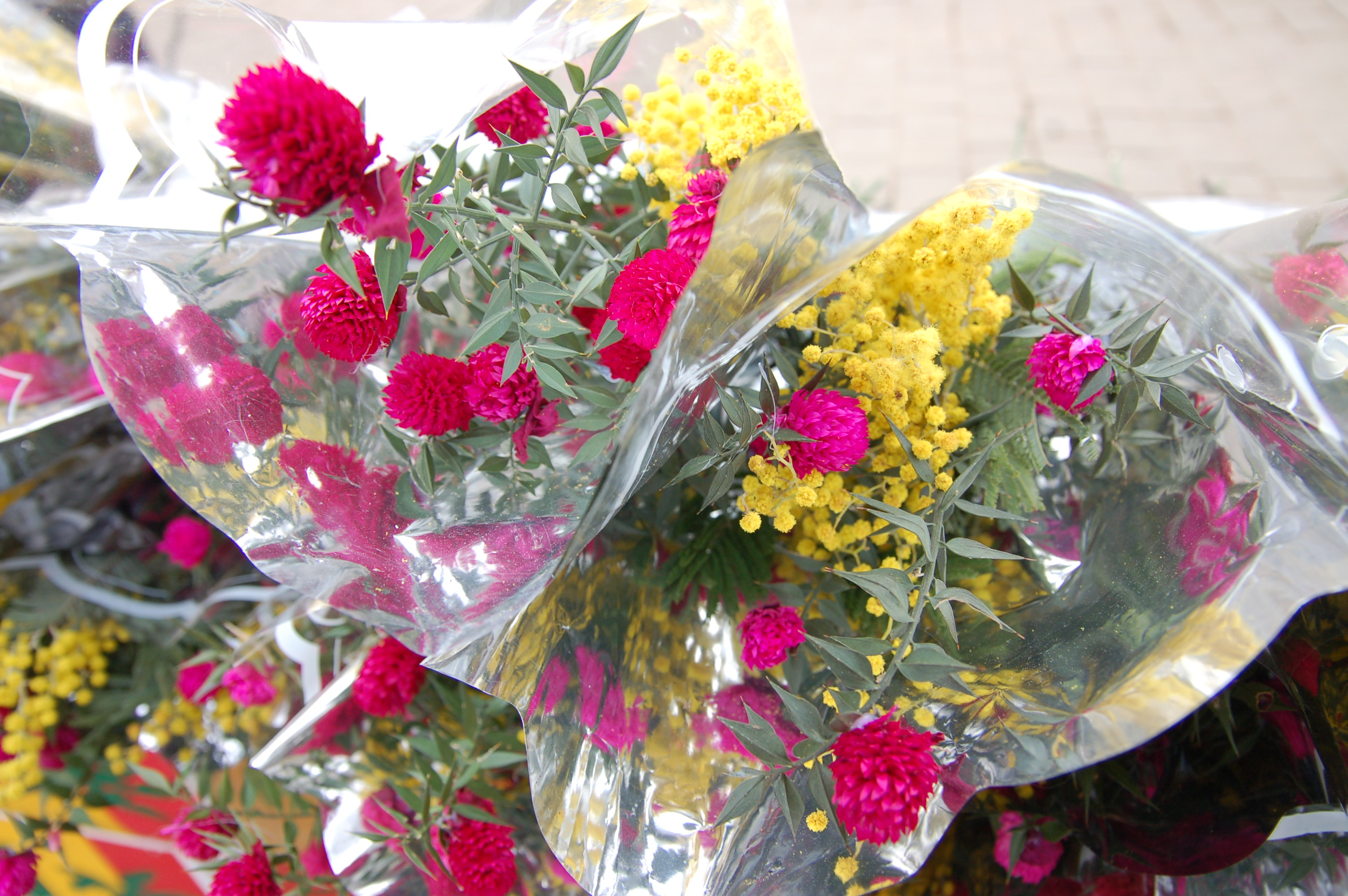 Есть тут же, на стихийном рынке и вариант бюджетный — та же, но жиденькая совсем мимозка в сочетании с дикой розой, тоже из знойного Азербайджана. Все удовольствие вместе с блестящей упаковкой — всего 100 рублей.