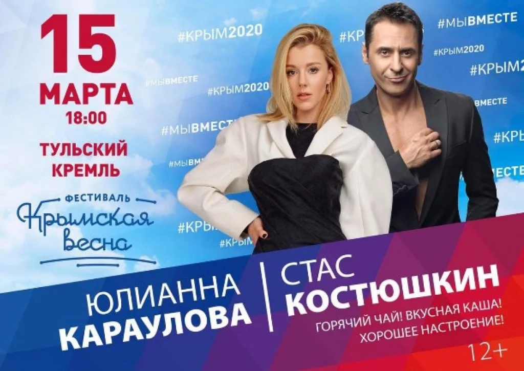 Фестиваль приурочен к воссоединению России и Крыма – «Крымская весна». 15 марта для туляков на празднике в Тульском кремле выступят Юлианна Караулова и Стас Костюшкин. Начало мероприятия: 18-00 по мск.