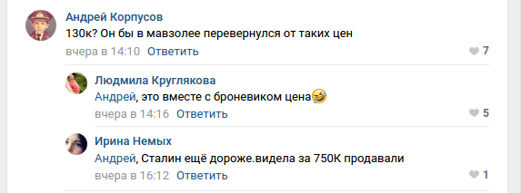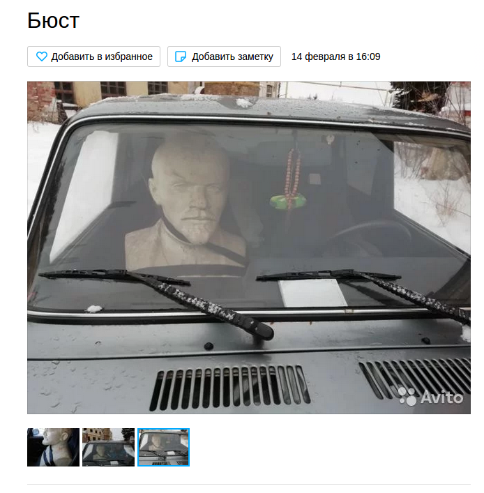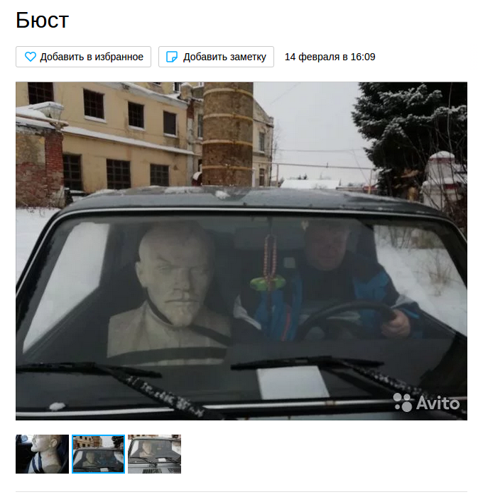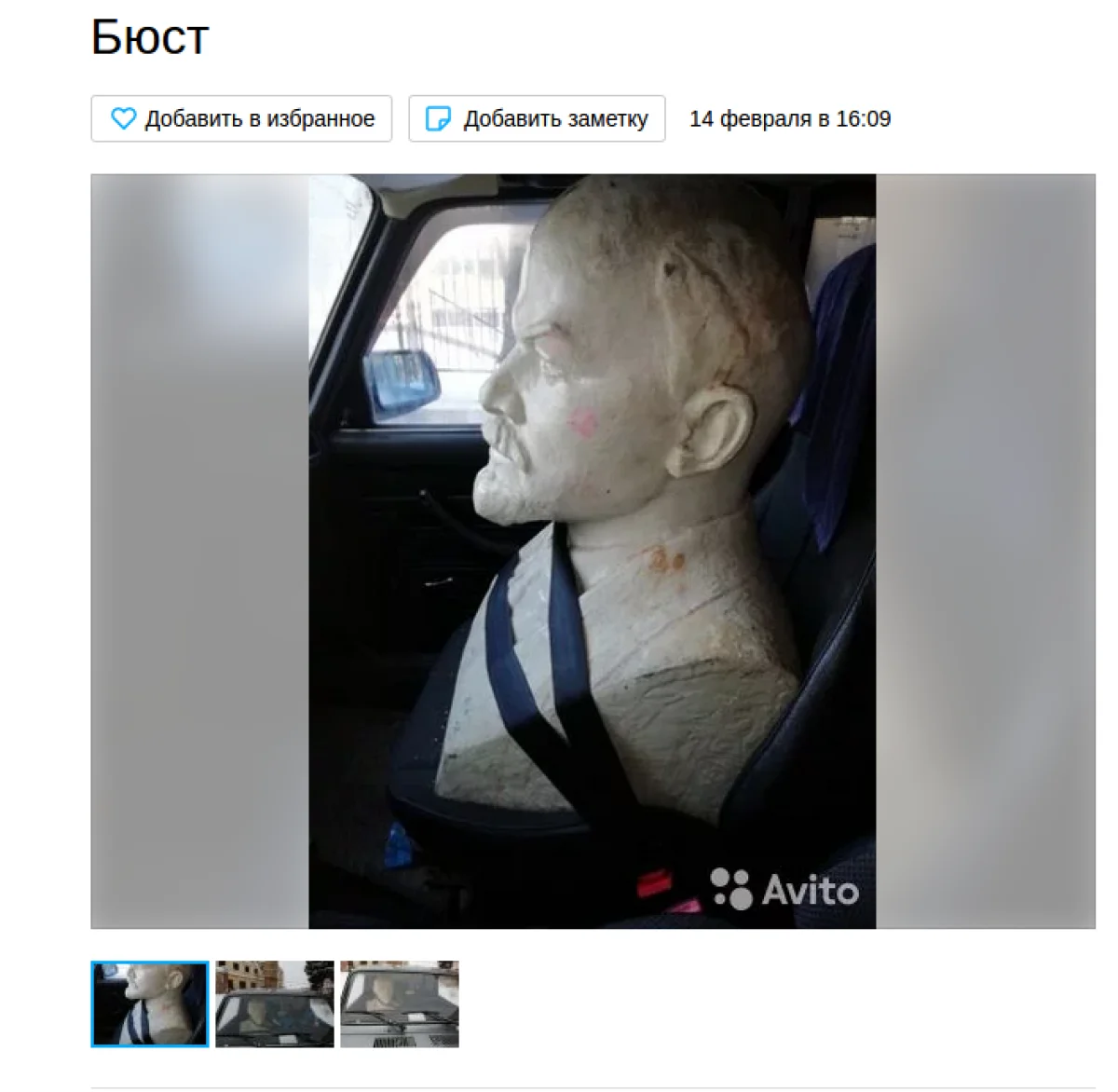 За бюст вождя продавец хочет получить 130 000 рублей. Бюст сделан из броны, уже немного потёрт, зато немного расцелован — прямо бронзовый Казанова. Объявление было размещено ещё 14 февраля в День всех влюблённых, но, видимо, такой «сердцеед» за 130 тысяч так и не смог найти себе покупателя или вторую половинку.